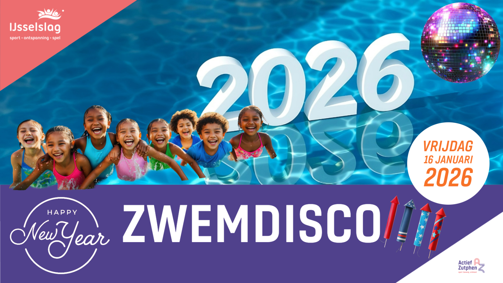 Op vrijdag 16 januari duiken we het nieuwe jaar in met een spetterend discozwemfeest! Van 19.00 tot 21.00 uur kun je samen met je vrienden lekker zwemmen, dansen en feesten op de leukste hits. Het zwembad staat helemaal in het teken van Happy New Year!